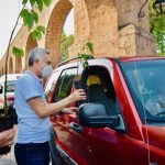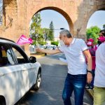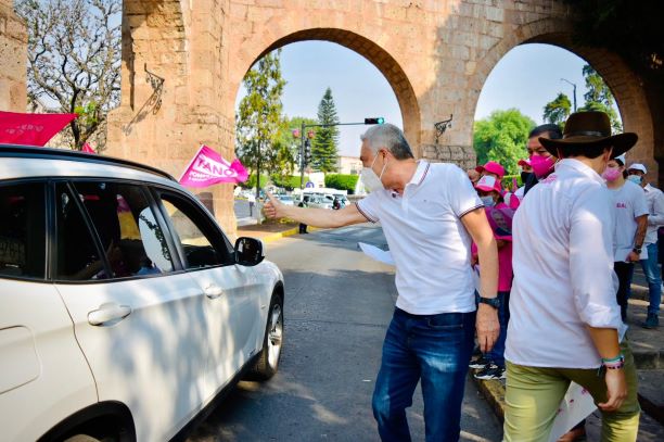 Rodeado de decenas de jóvenes y mujeres, Cristóbal Arias y su esposa María Ortega Ramírez saludaron a los transeúntes y a los automovilistas desde la avenida Acueducto y avenida Francisco I. Madero, en cuya intersección se encuentran dos de los más emblemáticos monumentos históricos de esta ciudad: el Acueducto y la Fuente de Las Tarascas.
