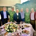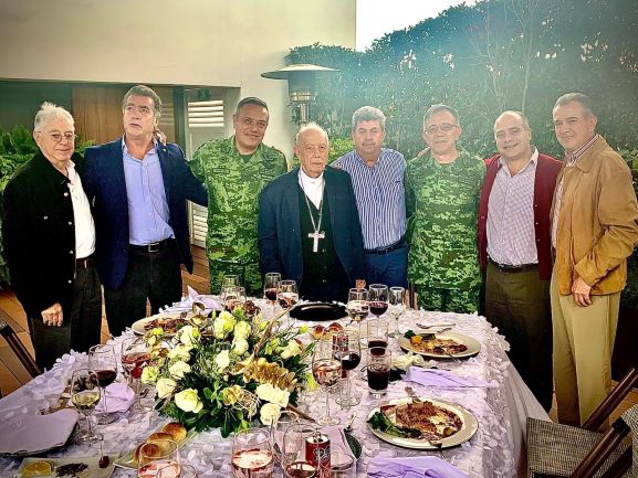 Alrededor de una mesa adornada con flores colmada de copas de vino y restos de los platillos degustados aparecen, además del general Barrera, el Cardenal Alberto Suárez Inda y los empresarios, Agustín y Juan Pablo Arriaga, Germán Ireta y Sergio Sistos.
