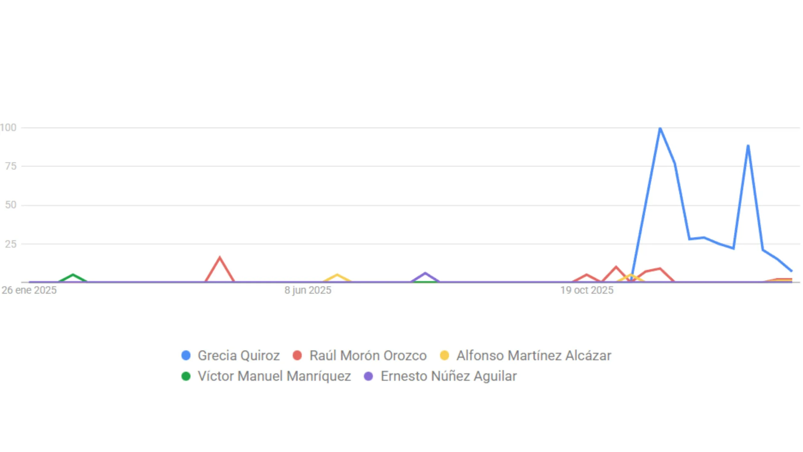 - El término centrado en el nombre por sí mismo. Como sucede con Víctor Manríquez y Ernesto Nuñez, cuyas búsquedas aparecen menos asociadas a partido o cargo, y más al reconocimiento del nombre propio.