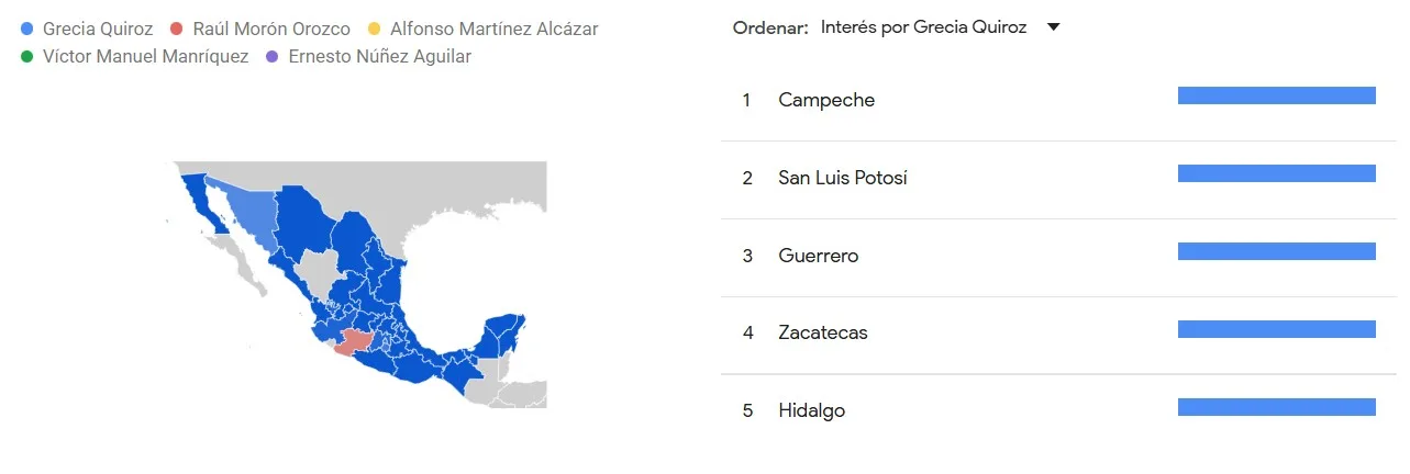 A nivel general, el nombre de Grecia Quiroz destacó notablemente, colocándose como el más buscado en buena parte de la geografía nacional. Solo pocas regiones (como Durango, Baja California Sur y Colima) carecen de información; pero casi todo el resto del país coloca a la alcaldesa de Uruapan como tema de alto interés durante el último año.