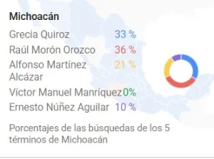 Los índices de búsqueda en Michoacán favorecen al senador Raúl Morón Orozco, quien concentra el 36% de las búsquedas, seguido muy de cerca por la presidenta municipal de Uruapan, Grecia Quiroz, con 33%.