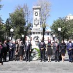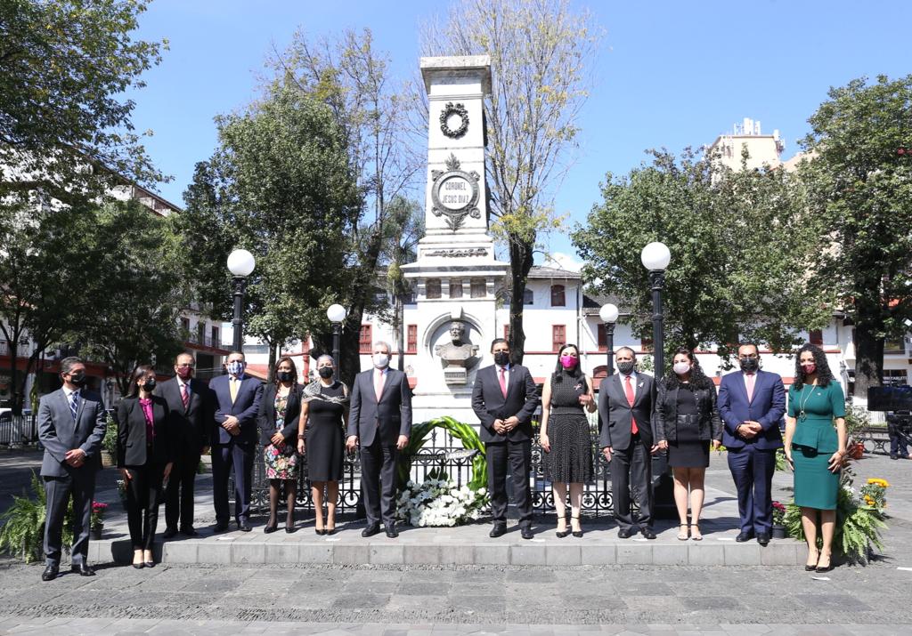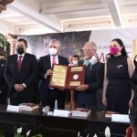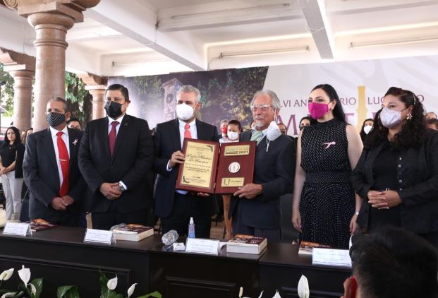 Uruapan, Michoacán., 21 de octubre 2021.- El gobernador Alfredo Ramírez Bedolla participó en el CLVI Aniversario Luctuoso Mártires de Uruapan donde el orador oficial fue el ex rector de la UMSNH, Jaime Hernández Díaz. En el evento se colocó ofrenda floral y se montó Guardia de Honor en el monumento de la Plaza Mártires. Al finalizar, el gobernador y el presidente municipal, Ignacio Campos Equihua entregaron la Presea Mártires de Uruapan en reconocimiento al mérito ciudadano a Juan Manuel Madrigal y Manuel Trejo García.