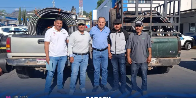 Uruapan, Mich.- Con el objetivo de fortalecer la infraestructura hidráulica y mejorar el acceso al agua potable en las comunidades, el director general de la Comisión de Agua Potable, Alcantarillado y Saneamiento de Uruapan (CAPASU), Luis Manuel Magaña Magaña, realizó la entrega de 1,000 metros de manguera de 1½ pulgadas a autoridades comunales de Chimilpa y San Martín Buenos Aires.