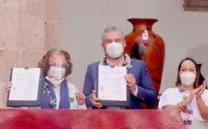 Morelia, Michoacán, 2 de febrero del 2022.- El gobernador Alfredo Ramírez Bedolla y la titular del Fondo Nacional para el Fomento de las Artesanías (Fonart), Emma Yanes Rizo, firmaron convenio de coordinación para fortalecer y promover la riqueza cultural de Michoacán a través de las y los artesanos.