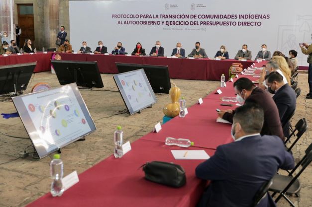 Morelia, Michoacán, 11 de enero del 2022.- El gobernador Alfredo Ramírez Bedolla encabezó la reunión de presentación de protocolo para la transición de comunidades indígenas al autogobierno y ejercicio del presupuesto directo.